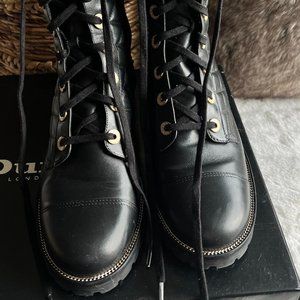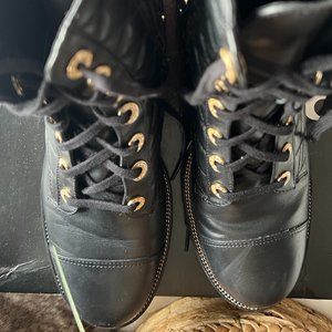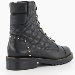 These are a classic pair of leather lace-up ankle boots with a stylish update. The quilted leather, gold eyelets and subtle round gold stud and pearl detailing around the ankle sets these boots apart. Chunky enough to look modern but with just the right amount of embellishment to look chic.