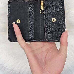 Black pebbled leather keyholder and small sections for bills/card holder.