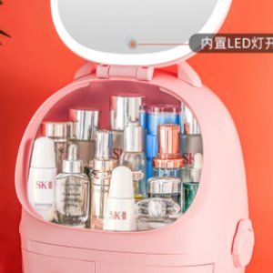 This Cosmetic Storage Box is an innovative storage solution that combines the functionality of a makeup storage unit and a vanity mirror.