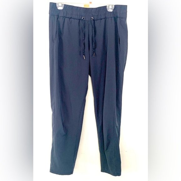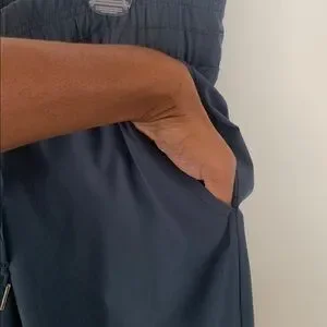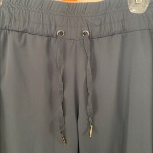 Comfortable blue drawstring pants. Perfect for casual wear. Features front and back pockets, the latter closed via zippers. Feels like a track pants in terms of comfort, but the fabric has a smooth and light finish.