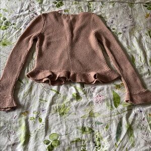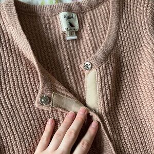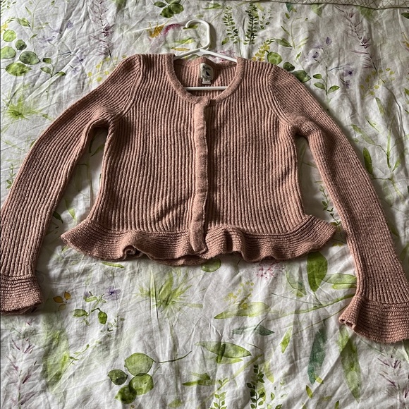 Cute ribbed cardigan in a soft blush hue. Has snap buttons at the front with frilly sleeves and scalloped bottom. Very pretty and feminine, reminds me a bit of Glinda in Wicked. I would style it with a jean skirt and booties.