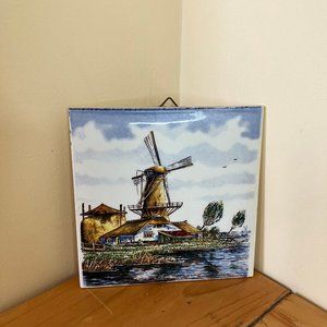 Dutch Windmill Hanging Ceramic Wall Tile 4 1/4" Square Vintage Holland Delft