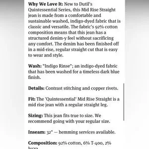 Why We Love It: New to Dutil's Quintessential Series, this Mid Rise Straight jean is made from a comfortable and sustainable washed, indigo-dyed fabric that is classic and versatile. The fabric's 92% cotton composition means that this jean has a structured denim-y feel without sacrificing any comfort. The denim has been finished off in a mid-rise, regular straight cut that is easy to wear and style.