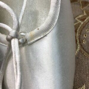 The left shoe has never left the plastic and is immaculate. The right shoe may have been tried on once, the right shoe has a tiny discolouration just under the bow