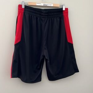 These athletic shorts feature a striking black and red design, perfect for enhancing your workout wardrobe. Crafted from lightweight, breathable fabric, they ensure comfort and flexibility during intense training sessions. The knee-length cut and elastic waistband provide a secure fit, making them ideal for basketball or any athletic activity.