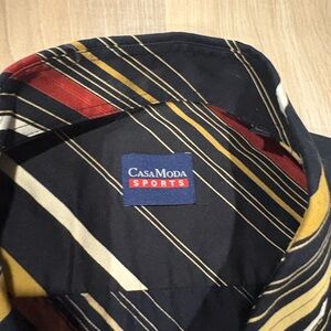 This casual button-down shirt showcases a striking design with bold black and red diagonal stripes, offering a stylish and relaxed look. The silky fabric adds a touch of elegance, making it perfect for casual outings or gatherings. Its long sleeves and classic collar enhance its effortlessly chic appeal.