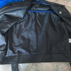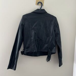 This black leather jacket from Dynamite features an asymmetrical zipper closure and a sleek moto silhouette. Its fitted, cropped design and silver hardware accents add an edgy touch to any outfit. The jacket's smooth leather finish makes it a timeless wardrobe staple. Pit to pit is 18 5/8 inches top to bottom is 20 1/2 inches and long sleeve length is 24 inches