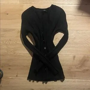 Soft ribbed knit cardigan in classic black. Button-front closure and slim fit. Easy to layer over tees or dresses. In perfect condition