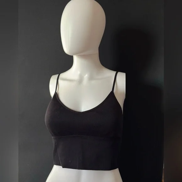 Minimal black ribbed bralette with thin adjustable straps and a flattering V neckline. Has padding that can be removed easily!