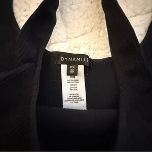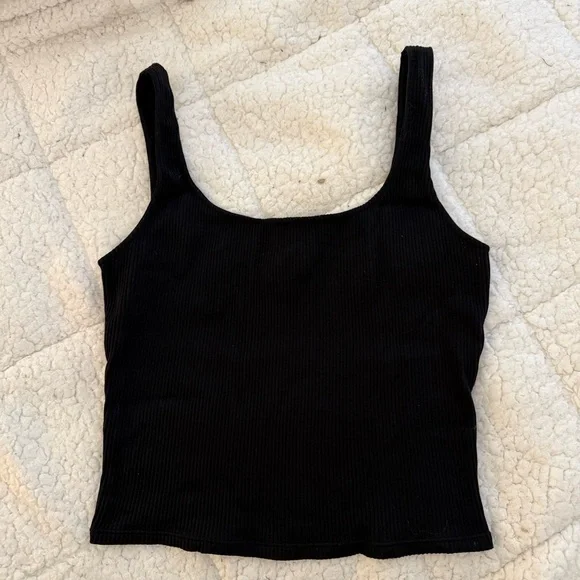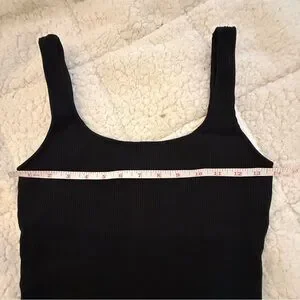 Black ribbed tank with a square neckline. Stretch knit fabric for a close, flattering fit. Wide straps for comfortable support. Simple, versatile piece for layering or wearing alone.