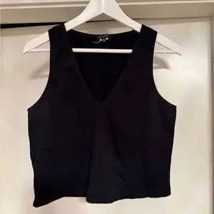 Chic black ribbed tank with a flattering V-neck. Ideal for layering or wearing alone.
