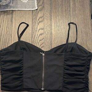 Stylish black crop top with ruched detailing. Ideal for a trendy look.