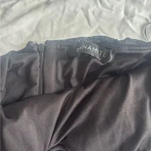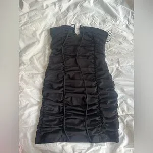 Chic black mini dress with ruched detailing. Perfect for a night out.