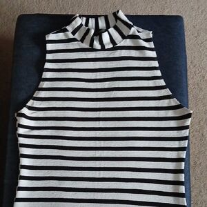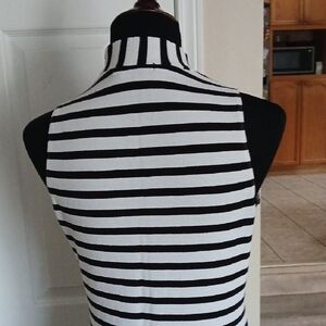 Chic sleeveless midi dress with bold stripes. Ideal for versatile styling.
