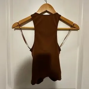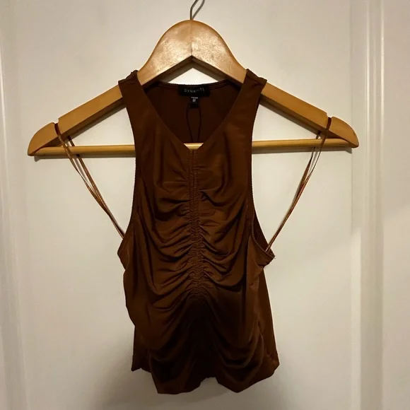 Stylish chocolate ruched tank. Sleeveless design. Perfect for layering.