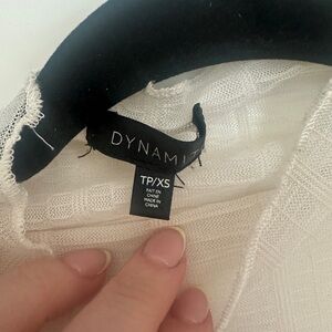 This cream blouse from Dynamite features a ribbed texture and long sleeves, offering a stylish and versatile addition to your wardrobe. Its soft fabric and elegant design make it perfect for both casual and dressy occasions.