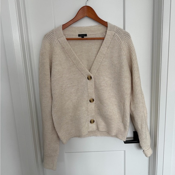 Cream ribbed V-neck cardigan with front tortoiseshell buttons. Soft knit for easy layering. Classic cropped fit for casual looks.