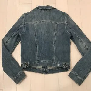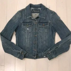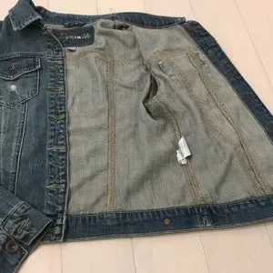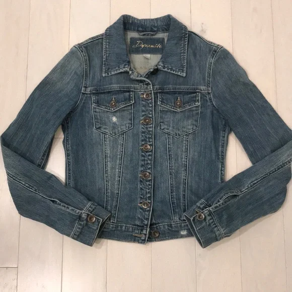 Size extra-small dynamite denim jacket. Cute distressed detailing. Perfect for wearing with a sundress as it hits at the waist/slightly cropped (depending on your height). In excellent condition.