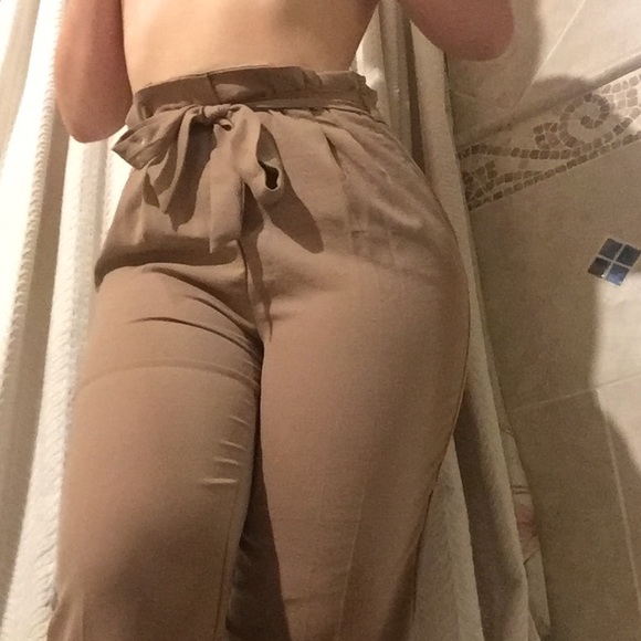 Light brown flowy bottoms with a drawstring that accentuates the waist