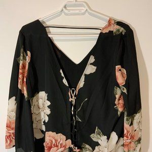 Beautiful floral black top with lace-up back detailing and bell sleeves.