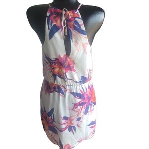 Chic halter dress with vibrant floral design. Perfect for summer outings. Has rope tie at back of neckline and a small elastic banded waist. Has a white polyester lining.