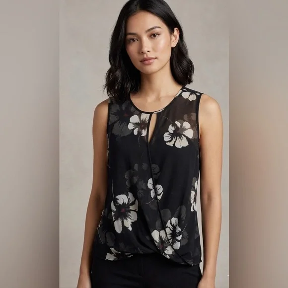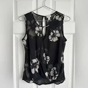 Selling this sleeveless black top from Dynamite with a pretty white and grey floral print. It has a high neckline that stays connected at the collar, creating a teardrop-shaped keyhole cutout.