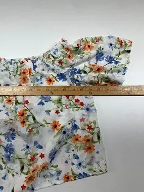 Lightweight and airy with a soft sheer overlay, this piece has the prettiest wildflower print in blue, orange, and green tones. Features flattering ruching along the side and a one-shoulder silhouette that gives it that effortless feminine vibe.