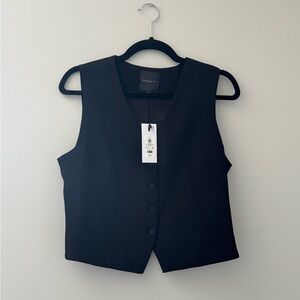 Dynamite Forest green sleeveless vest dress. Features a sleek design with front pockets, elastic waist, and gold metal accents on shoulders.