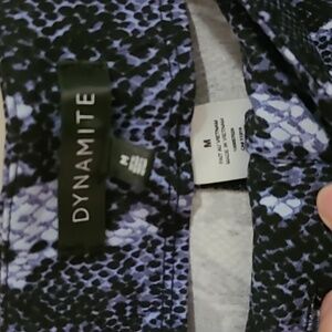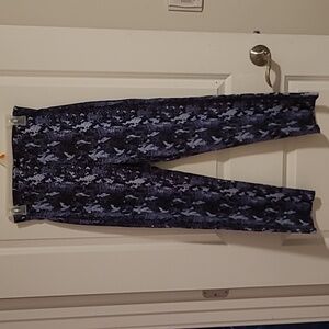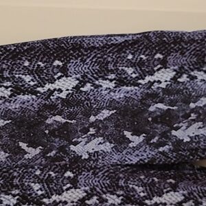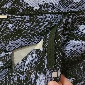 Beautiful slender leg pants in shades of blue snakeskin print. Size medium but fits snug. 13" waist across, 25" inseam. Slight stretch in the waist, zip, clasp, and button closure.