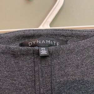 Experience the perfect blend of comfort and style with these Dynamite trousers, featuring a sleek gray design with contrasting black waistband. Crafted from a stretchy fabric, these full-length trousers offer a snug fit ideal for both casual and athletic wear.