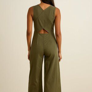 Stylish khaki jumpsuit with a sleeveless design. Ideal for versatile wear.