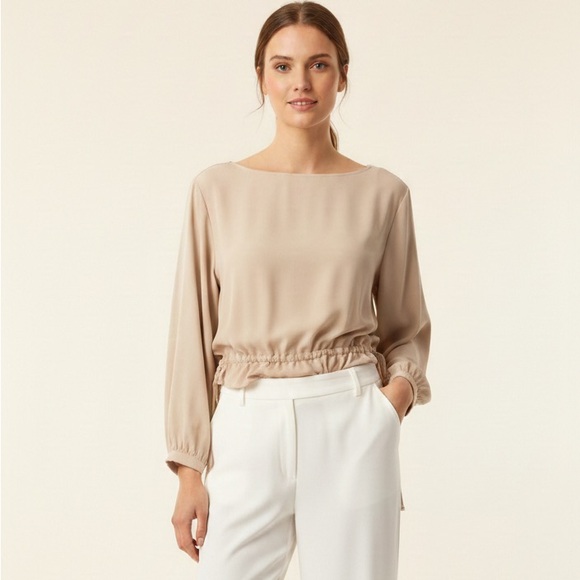 Chic beige blouse with drawstring detail. Long sleeves and relaxed fit. Perfect for versatile styling.