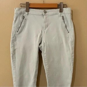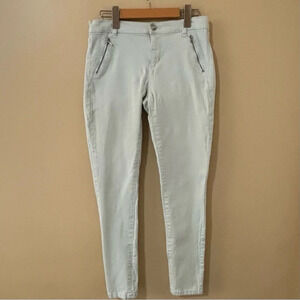 With cute zipper details, these Dynamite “Kate” skinny distressed denim pants are a very light mint green, size 28. In very good condition, laundered and ready to wear.