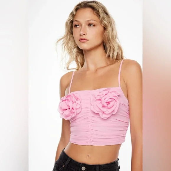 Elegant light pink camisole with ruched front. Features floral accents. Perfect for stylish outings.