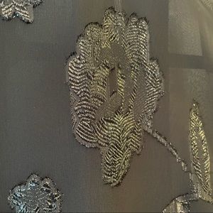 Long black kimono duster from Dynamite. Shimmer floral design. Length is 45”. 100% polyester.