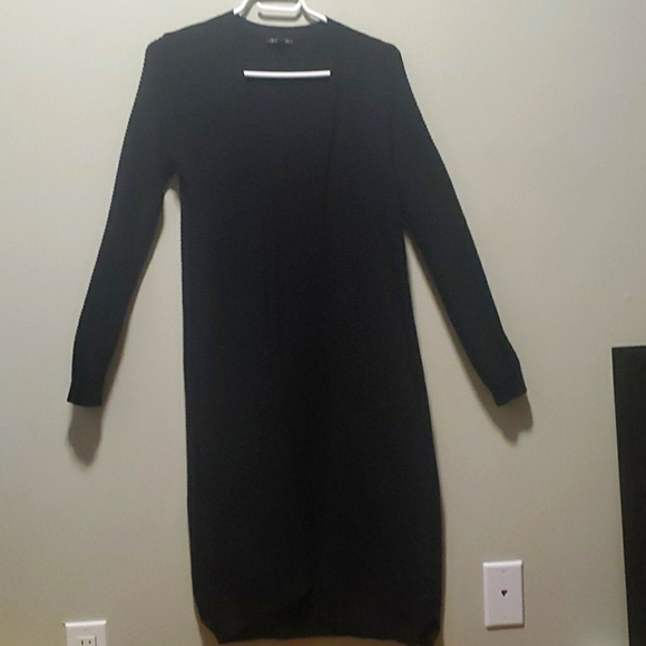 Nice lounging black cardigan. Arm length 24 inches, Shoulder 15.5 inches, length 42 inches. there are some spots where the thread are pulled but its not too visible. it is shown in some of the pictures.
