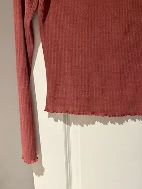 Slim-fit ribbed long-sleeve tee in a warm rust tone. Soft stretch fabric with subtle lettuce-edge hem. Simple crew neckline for everyday wear. Pair with jeans or skirts for casual looks.