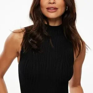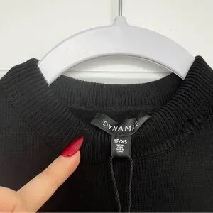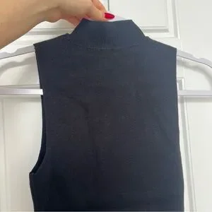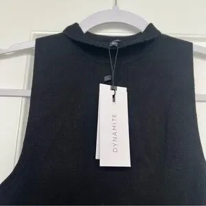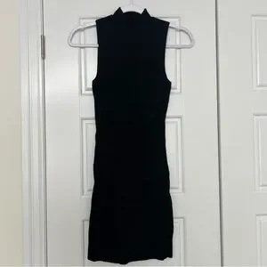 Sleek black mini dress by Dynamite. Features a sleeveless cut. Ideal for evening wear. This is a rib-knit dress - Designed to be fitted to accentuate your form. Mock Neck and ribbed. In perfect condition, never worn, tags still on. Size xs but will definitely comfortably fit small.