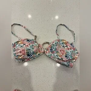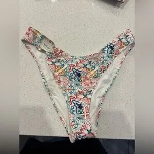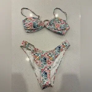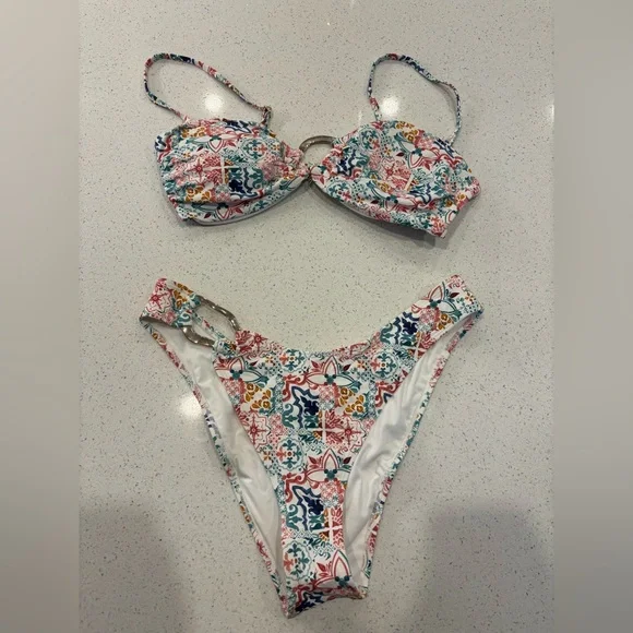 Stylish bikini set with a dynamic pattern. Features a blend of red, blue, and gold hues.