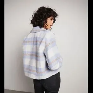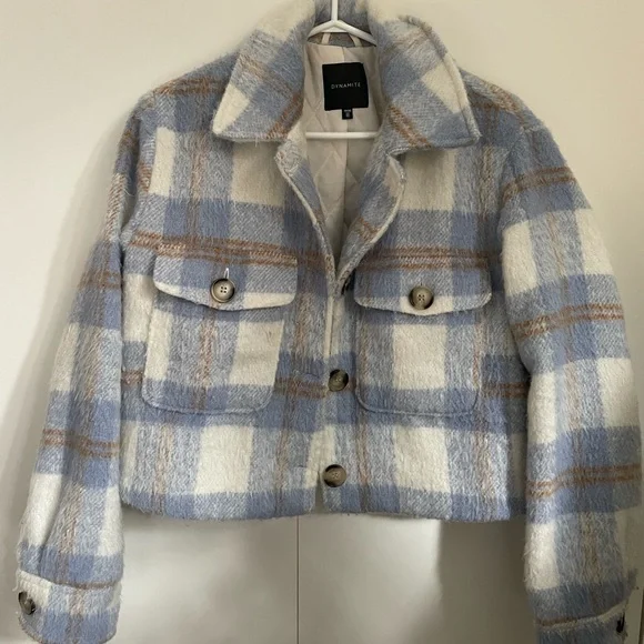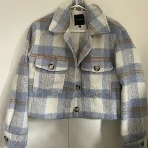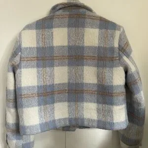 Description: Light blue and white checks with tortoiseshell buttons, two pockets, fully lined and filled (colour in natural bright light is the same as it is on the model)