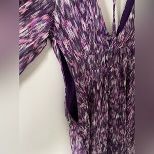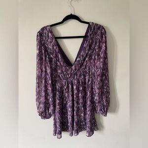 Gorgeous purple patterned dress with beautiful low cut neckline and sheer bellow-y sleeves! Perfect for date night, and special occasions! Discrete zipper on the side for beautiful fit. Size S ๐