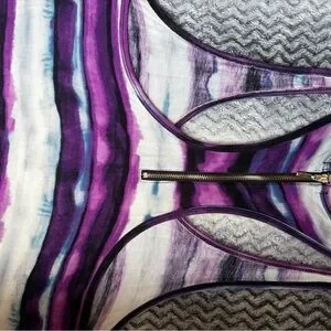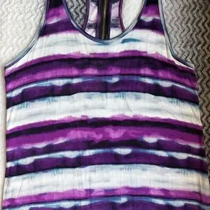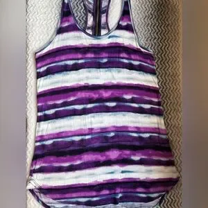 Lightweight racerback tank with horizontal purple and white stripes. Soft, breathable fabric with casual fit. Easy to pair with jeans or leggings.