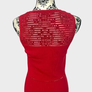 Bold and feminine sleeveless knit dress in vibrant red. Features eyelet mesh detailing at the neckline, waist, and hemline for a modern, flirty touch. The fit-and-flare silhouette flatters the figure while the stretchy knit ensures comfort. Perfect for date nights, parties, or special occasions.