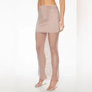 This is a sheer top and skirt with all over rhinestone details. Comes with a separate nude bandeau bra. This is a sheer rhinestone maxi skirt. Designed with a built in mini skirt.