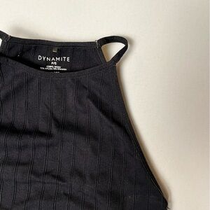 This sleek black ribbed tank top from Dynamite features a minimalist design with a flattering high neckline and slim straps. Perfect for layering or wearing on its own, it’s ideal for casual outings or pairing with dressier pieces. Size S. Gently used, in excellent condition.