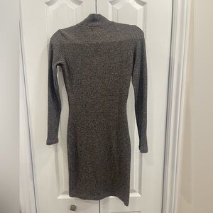 Chic and cozy ribbed knit sweater dress by Dynamite. Features a mock neck, long sleeves, and a flattering fitted silhouette. Soft stretchy fabric — perfect for fall and winter layering.