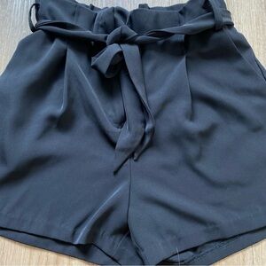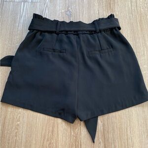 Of a midnight, velvety black, this is a tailored paper bag short with a removable belt. Features hook and zipper fly, adjustable belt, belt loops to change up how you accessorize, pleated detail, slash side pockets, welted back pockets, wide leg.
