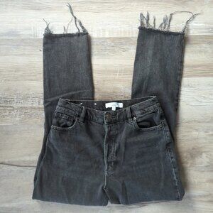 High waisted straight leg jeans by Dynamite. Thicker charcoal washed black denim with a hint of stretch. Ripped knees and raw cut hems.
