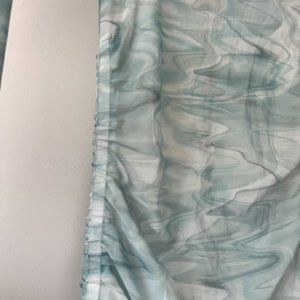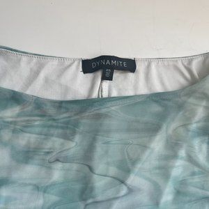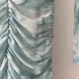 Dynamite Ruched Slinky mini dress. Ruching down the sides and straight down the back for a sexy fitted yet comfortable look. Lined body with sheer mesh sleeves. The pattern is on a mesh overlay. Swirly pale green and cream. Size Small.
