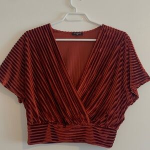 Chic rust velvet crop top with ribbed texture. Features a stylish wrap design. Perfect for casual or dressy looks.